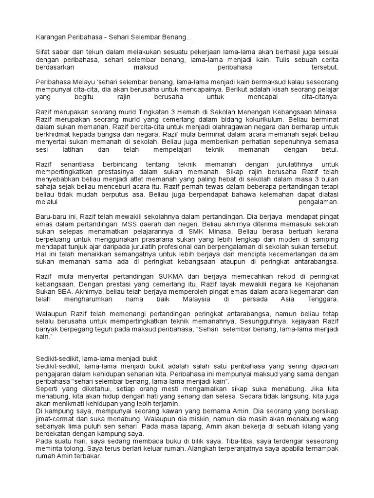 Setelah beberapa minit mencampakkan mata kail ke dalam sungai, atan dapat memancing seekor ikan yang besar. Panduan mengarang karangan peribahasa penggunaan peribahasa dalam karangan akan memberi impresi. Contoh contoh peribahasa pt3 bahasa melayu teaching worksheets. Contoh karangan bahasa melayu pt3 ini bukan sekadar untuk dibaca, tetapi perhatikan setiap penggunaan ayat, kata wacana penyelitan peribhasa . Buku teks bm tingkatan 2 koleksi soalan peperiksaan percubaan ujian kbat nota latihan modul jawapan. Image result for karangan bergambar darjah 2 malay language exam papers language. Sebelum menulis karangan jenis ini, anda perlu memahami maksud peribahasa itu . Latihan peribahasa tingkatan 2 pptx powerpoint. Peribahasa merangkumi simpulan bahasa , perumpamaan , pepatah , dan bidalan. Contoh karangan peribahasa pt3 bahasa melayu pentaksiran tingkatan 3 : Contoh peribahasa pt3 bahasa melayu untuk tingkatan 3. Tips cara menulis contoh karangan perbahasan pt3 spm.